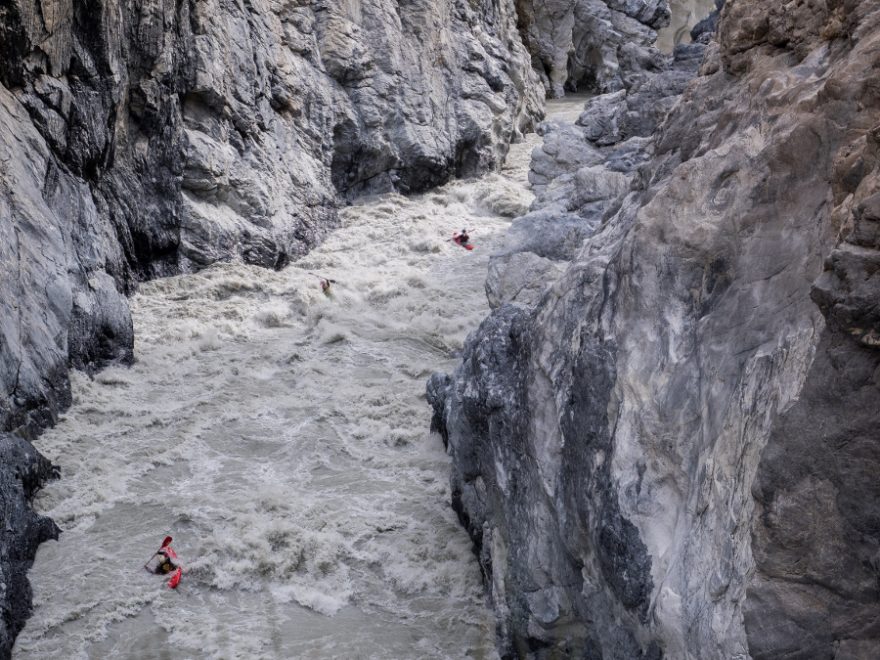 Celá peřej se mění na kličkování mezi obrovskými vlnami a následný sprint do relativně malého vracáku, kde nás čekají ostatní. Mají prohlédnuto o kus dále, a tak valíme do další nepřehledné peřeje jeden za druhým podle Jordyho instrukcí. Po většinu dopoledne jedeme ve stejném stylu. První pádler vyleze, prohlédne a následně pošle ostatní. Jde o jedny z největších peřejí, jaké jsem kdy jel. Kaňon nad námi je úplně uzavřený, jako by signalizoval, že jediná cesta je po proudu. Rozplavba a ztráta lodi je zde nemyslitelná.