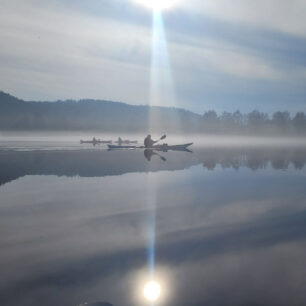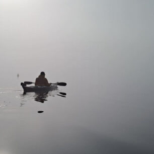 Po seznamovacím večírku v trampské hospodě U Taterů a ranní kalorické snídani jsme dali na vodu na skluzu v Třebenicích. Do první zatáčky je nedaleko a mlha ještě nebyla tak hustá. Tam to ještě byla legrace. Ale dál, okolo Rovínku, směrem na Ždáň, tam už jsme směr jen odhadovali podle slunka, které zvrchu zářilo do mlhy. Odněkud ze zářící bílé bylo slyšet hlasy roztroušených kamarádů a celkem všem bylo trapné zapnout mobil a podívat se na mapu, kudy máme plout. Zabloudit do některé z hlubokých zátok by v těchto podmínkách šlo snadno. Nejvíc se vyjasnilo během tradiční svačiny na Nebřichu. Ale dál už zase mlha houstla. Nakonec jsme se všichni zdárně (s dojezdy lišícími se v řádu hodin) sešli v cíli, nařezali dřevo na oheň a utábořili se. Jen jeden nejmenovaný kamarád po postavení stanu zjistil, že si nechal v Třebenicích spacák a dal si 18 km pádlování na start a pak 18 km plus zajížďky s blouděním tmou zpátky.