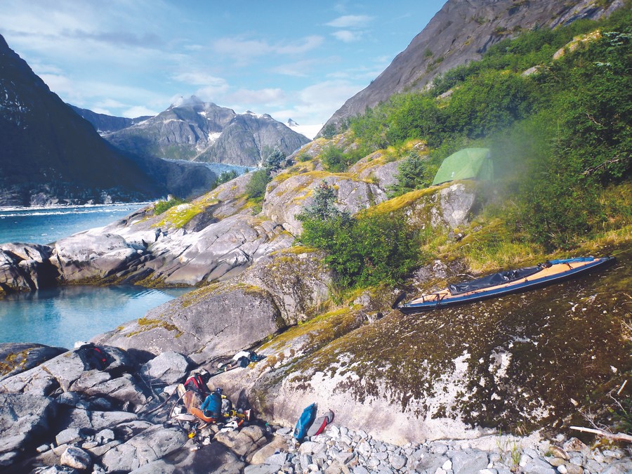 Jediný možný kemp na skále u ledovce v Le Conte Bay