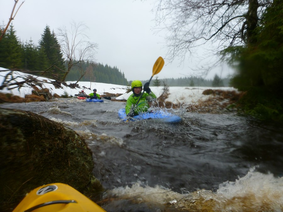 Galerie: Březnové pádlování na Schwarze Pockau aneb zpěněná voda řítící se mezi skalami i ztracené pádlo