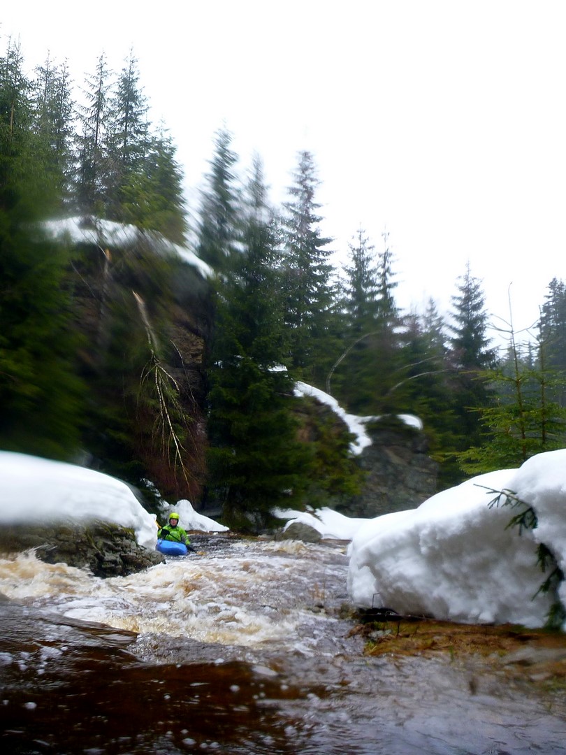 Galerie: Březnové pádlování na Schwarze Pockau aneb zpěněná voda řítící se mezi skalami i ztracené pádlo