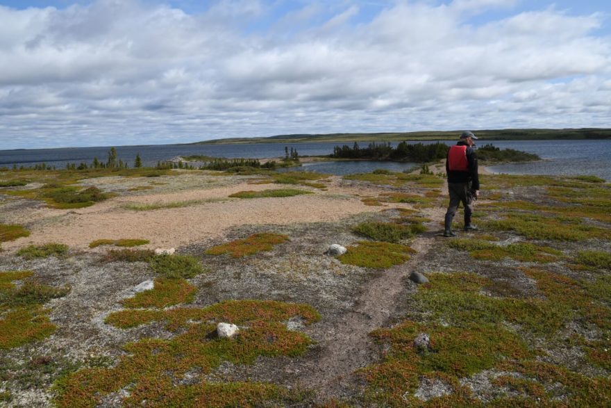 Na pravěkém inuitském tábořišti. V popředí kameny na kotvení týpí.