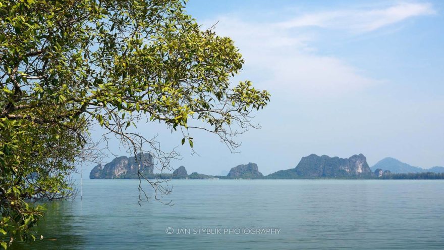Pohled z mangrove ostrova Ko Libong na skalnaté pobřeží pevniny.