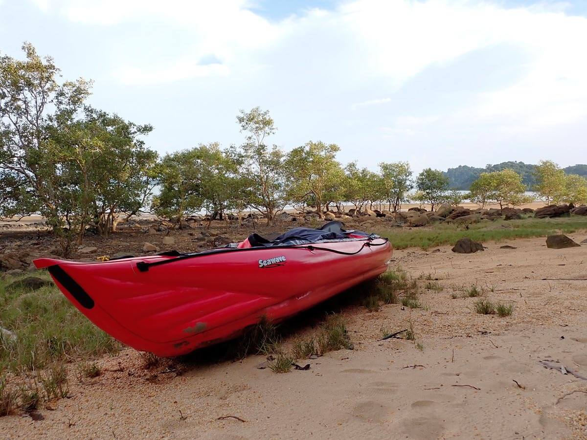 Pláž mám přímo před hamakou, řada stromů je během přílivu ve vodě.