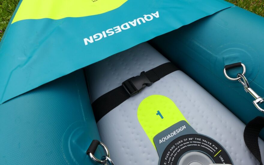Drop-stitch podlážka je k lodi uchycena dvojicí plastových popruhů ve špici a zádi.