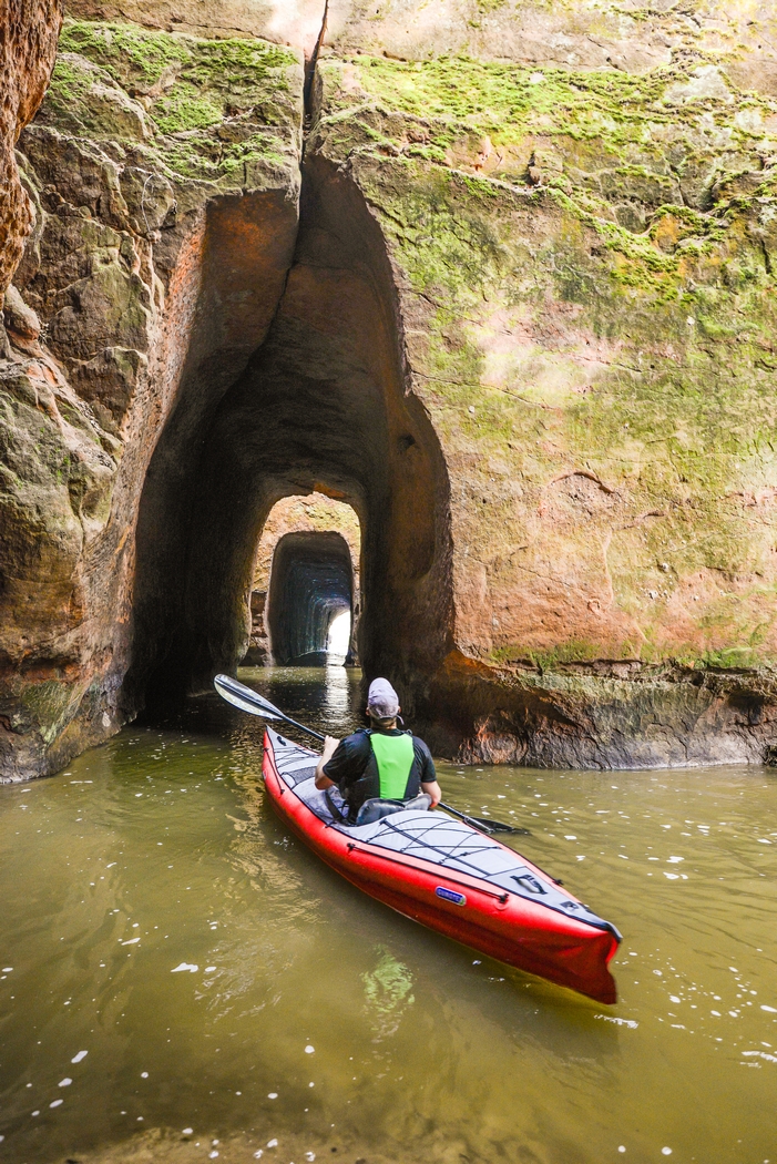 Vjezd do Průrvy Ploučnice, zvané též Pekelný jícen, Hromová rána či Čertova díra. Dva skalní tunely byly před staletími ručně vykopány v pískovcové skále, vodní dílo sloužilo jako regulace vody pro přilehlý hamr
