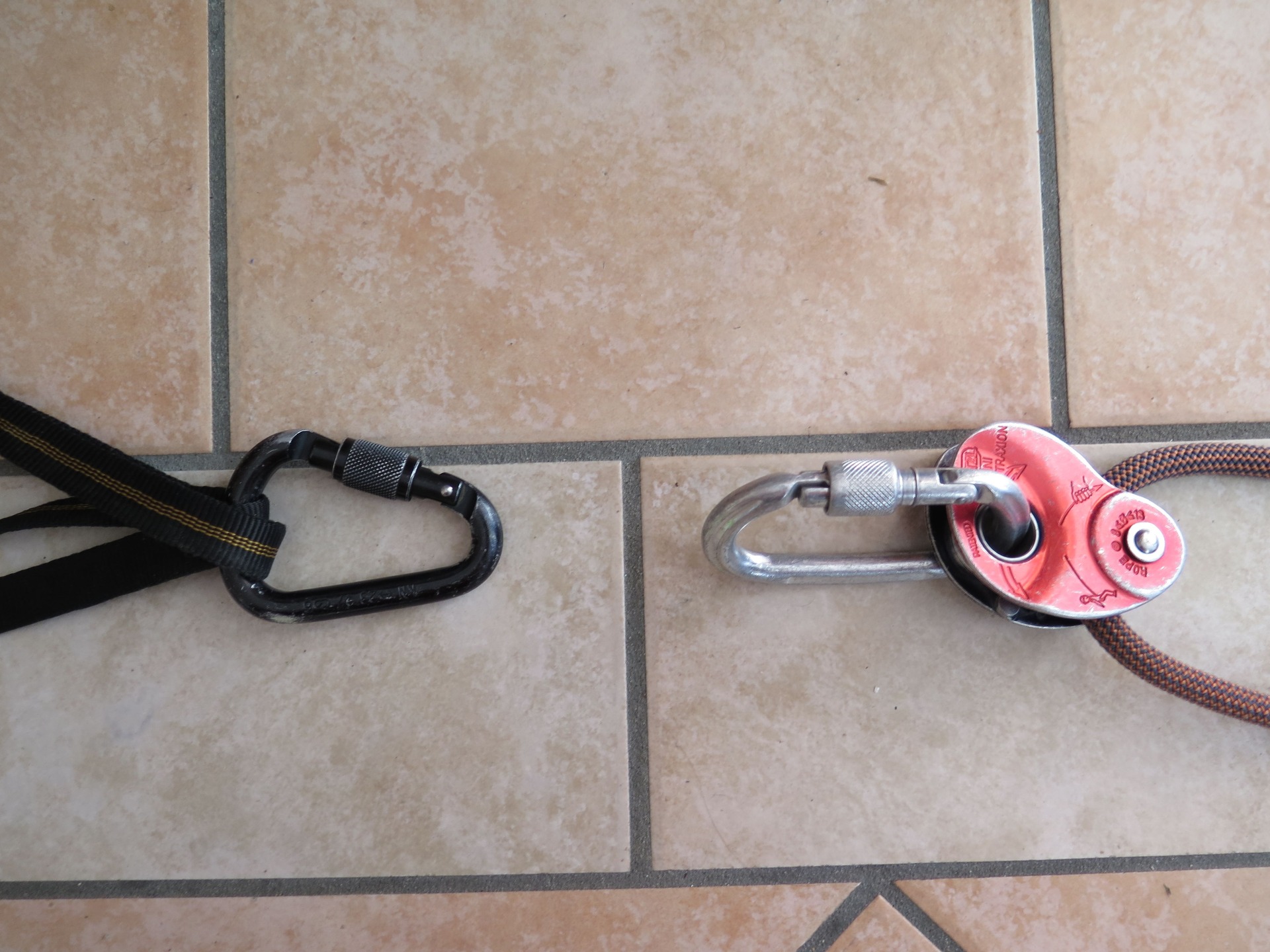 Nachystáme si jednu karabinu do kladky s blokantem a jednu do kotvícího bodu