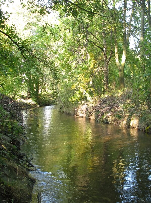 Regulované koryto u hráze rybníka v Dolní Libině.