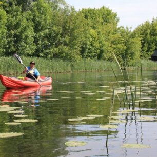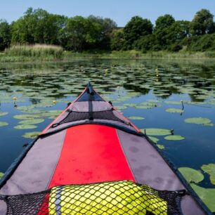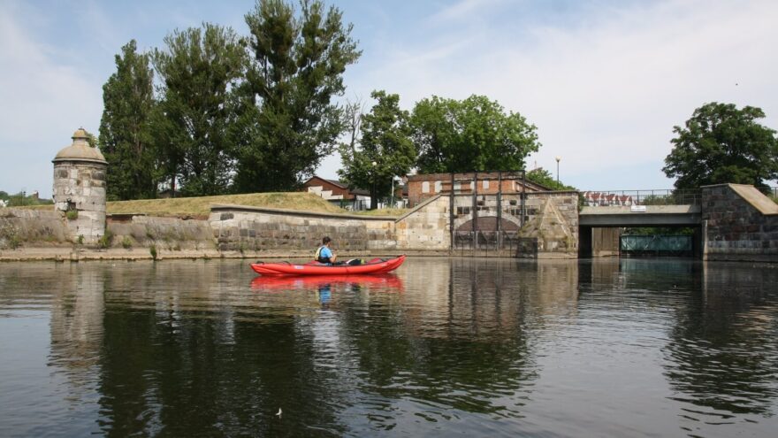 Na úvod podplouváme dvojici zmíněných mostů a zdravíme se s mnoha veslaři, kteří sem dopluli z několika nedalekých loděnic. Po chvíli už je potřeba zbystřit a trefit odbočku doleva, do toku zvaného Opływ Motławy. To se nám daří, a jen co proplujeme kolem mola jedné z veslařských loděnic a několika kotvících motorových lodí, ocitáme se na krásné řece „tekoucí“ (proud aby tady člověk pohledal) poměrně klidnou přírodou. Opływ Motławy je uměle vytvořený kanál, který sloužíval jako vodní příkop ještě v dobách, kdy bylo město opevněno takzvaným bastionovým opevněním. Když se podíváte na mapu, uvidíte původní tvar hradeb, který je tokem do dnešního dne kopírován. Vzhledem k vývoji vojenské techniky původní opevnění postupně ztratilo význam, hradby byly srovnány se zemí a upomínkou na jejich dřívější existenci je jen několik zastávek s naučnými cedulemi na břehu kanálu, po němž plujeme. Jinak je okolí přebudováno na velmi pěknou a klidnou rekreační zónu. I kanál samotný je poklidný, břehy jsou porostlé rákosím a každou chvíli se musíme prodírat porosty rozkvétajících stulíků.