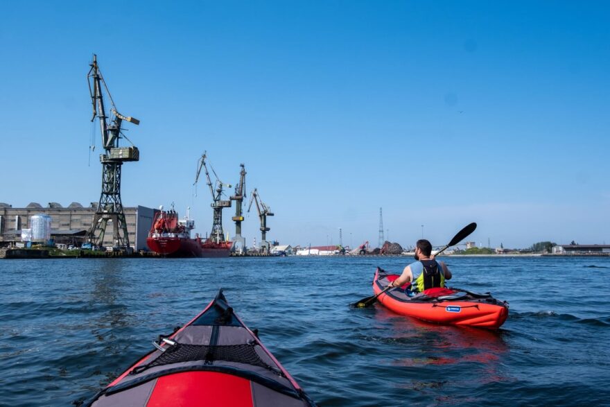 Když jsem plánoval trasu, měl jsem nejprve vskutku velkolepé plány zahrnující i výjezd na moře a obeplutí ostrova Wyspa Portova ležícího mezi samotným městem a Baltským mořem. Naštěstí včas zasáhl Bouzíno, který správně spočítal, že okruh 35 km na nafukovacích lodích a prohlídka města k tomu nám moc nezapadá do jednodenního plánu. Uklidnil jsem hormony, plán přehodnotil, ale pořád jsme chtěli zrealizovat prohlídku města „pořádně“ a proplout v něm co možná nejvíc míst.