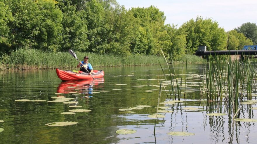Odtud už nás čeká jenom nějakých 2,5 km pádlování proti proudu řeky Martwa Wisła k dvojici mostů a k autu.