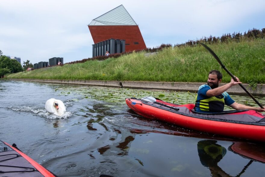 Přímo u starého námořního jeřábu končí také „sýpkový ostrov”, který tu kanál odděluje od dalšího ostrova jménem Ołowianka (olověný), kde se skladovalo olovo. Tento ostrov vznikl uměle prokopáním kanálu Na Stępce. My ostrov necháváme po pravé ruce, dál se kocháme tím, co nabízí pravý i levý břeh, a na chvíli se zastavujeme u velké lodi jménem Sołdek, která byla první lodí vyrobenou v Polsku po druhé světové válce. Dnes je z ní muzeum. Dále podplouváme pod zvedacím mostem, vpravo se tyčí ruské kolo a už se blíží ústí toku Kanał Raduni, po němž jsme se sem původně chtěli dostat. Vyrážíme „proti proudu“, ale po chvíli, jen kousek nad moderní budovou Muzea 2. světové války, nás zastavuje nevrlý labuťák precizně střežící svoji choť a potomky. Žene nás pryč z kanálu a my si říkáme, že nám to staré centrum po vodě opravdu není souzeno.