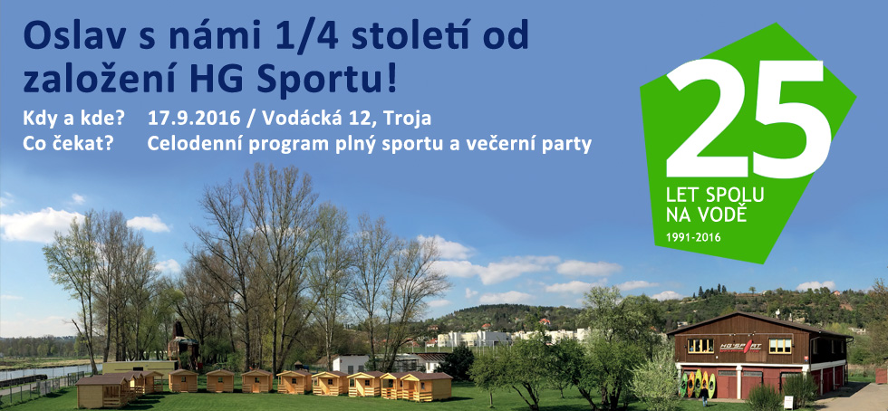 Od roku 1991, tedy rovných 25 let, působí v českém vodáckém světě firma HG sport, výrobce a také prodejce vodáckého vybavení. Při této příležitosti pro vás tým HG sportu připravil oslavu, na kterou jsou všichni vodáci srdečně zváni, a která se uskuteční 17.9. v areálu HG sportu u trojského kanálu (Vodácká ulice č. 12). Těšit se můžete na celodenní sportovní program a večerní party. K oslavám je v kamenném obchodě i eshopu HG sportu připravena řada zajímavých slev!