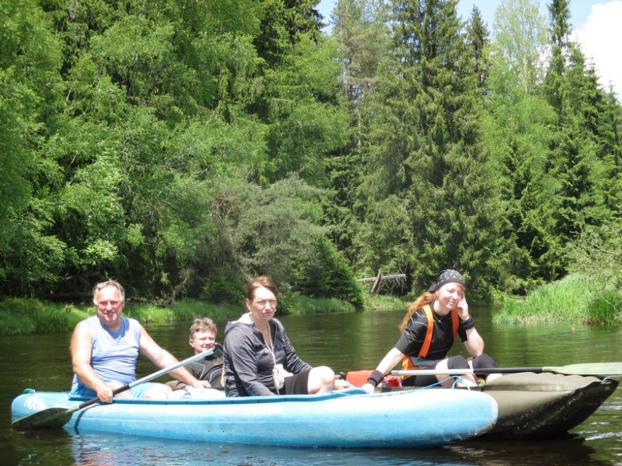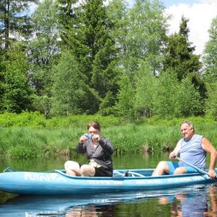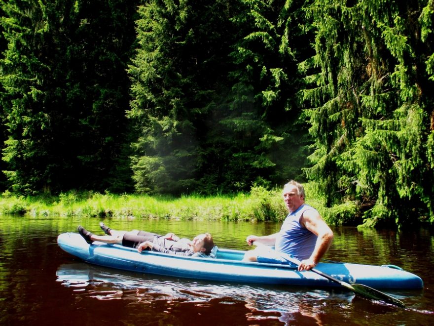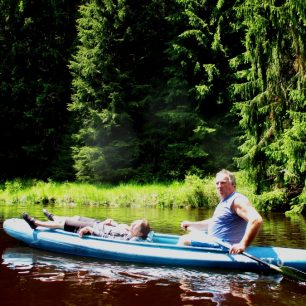 Opřeli jsme se chutě do pádel a prolétli víceméně bravurně celou část až do Žampachu. Samozřejmě, nevýskala ani před jedním jezem. Zato, když byl u řeky pěknej barák s kytkama, pes nebo kočka, tak to jó.