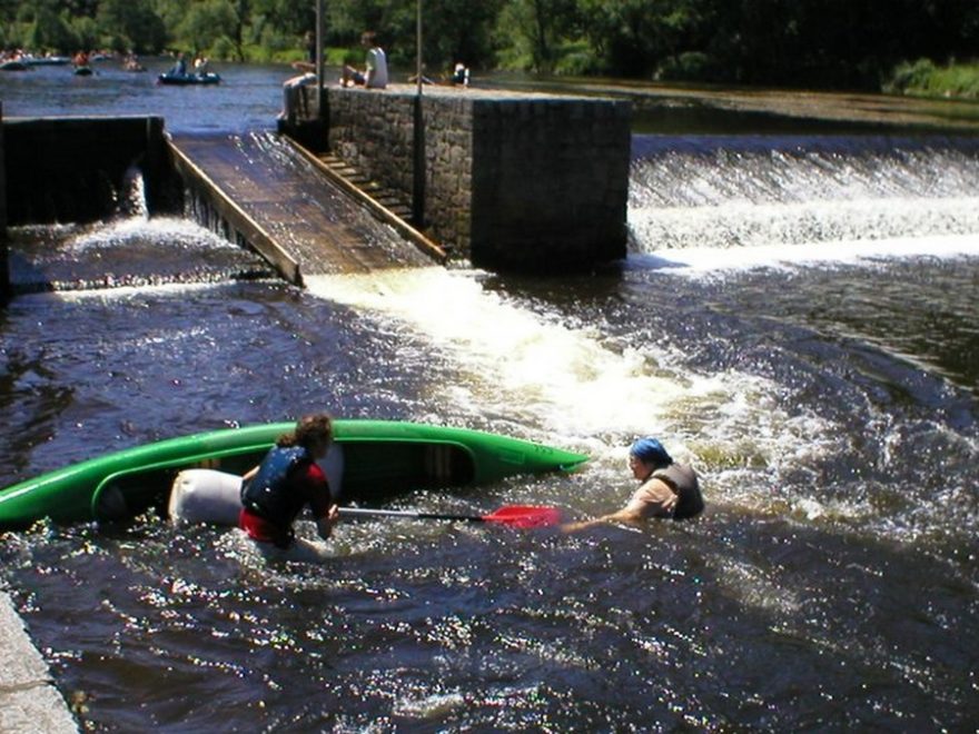 Strom, položený šikmo přes proud pod šlajsnou je však zrada. Navíc proud kolem jeho kmene si nás nekompromisně stáčí doleva, přímo na ten balvan, před kterým mizí pod hladinou. Tady vycítím poslední šanci: „Jani přitáhni!!“ A vzápětí mocně zabírám a nakláním loď napravo. Jana krásně zanoří pádlo napravo, dál od lodi, to se však hned zachytí svým oplechovaným, roztřepeným koncem o ponořený strom, aby ji ve vteřině vyškublo z lodi, jako když na podzim uklízíte Jiřiny. Nepustila se pádla a v mžiku zmizela nenávratně za lodí. Mě mezitím proud tlačí dnem lodi na ten kámen. Snažím se to zarputile vyrovnávat vysedáváním až na levý bort lodi, ale kdeže! Za okamžik už splývám proudem za převrácenou lodí. Říše Aegirova a Njordova*** si nás dokonale rozebírá. Jana, věrna plně mé instrukci, že nikdy nesmí pustit pádlo, ho neustále třímá v rukách a padá s ním do vln, když jí zběsilý proud podráží nohy. Jedinou radou, kterou jsem jí zapomněl dát, bylo, že se nesmí v proudu snažit postavit a na to teď těžce doplácí.