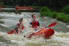 Tak s tím je teď konec. Náhon je důkladně zahrazen balvany. Celá řeka teče přes jez, většina vody přímo jednou z posledních klasických vorových propustí na dolní Sázavě a šlajsnu uzavírá nádherná mohutná vlna. Zadarmo to samozřejmě není, na rozhraní proudu a vracáku pod šlajsnou zůstala po nějakém bagrování nešťastně umístěná halda kamení, která proud rozděluje a významně tak likviduje snahy o jakoukoli jinou taktiku, než jet na střed přímo rovně. Ovšem kilometrový úsek pod jezem, který má konečně a zřejmě naposledy dost vody, za nějaké trable stojí.