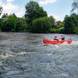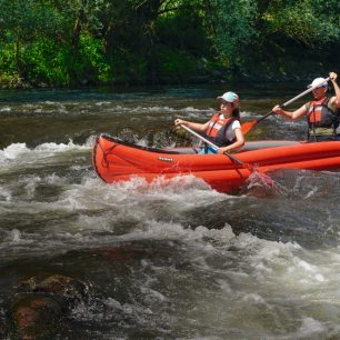 Míjíme tábořiště a podél rozhraní proudu s rezervou magneťák objíždíme. To už se tolik nedaří některým kanoím v druhé dnešní skupince vodáků, kterou potkáváme. Naštěstí je pod peřejkou klidnější voda, kde mohou vylít lodě a pochytat uplavaná zavazadla.