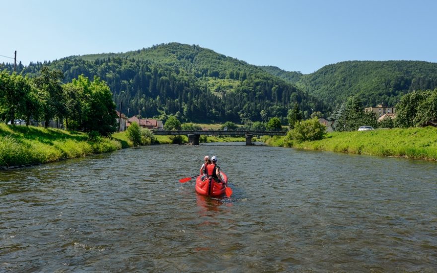 Pojďme ale nejprve na vodu, kvůli tomu jsme přece na Horehronie přijeli! Úsek z Nemecké do Šalkové by podle dostupných informací měl být ideální pro naše dvě kanoe Scout: řeka tu svižně teče a přitom je splavná v podstatě celoročně, nehledě na suché počasí. Podle místních znalců bychom mohli splouvat již z vesnice Lopej, zdejší náhon ale odvádí dost vody z hlavního řečiště, a tak volíme jistotu a ráno přijíždíme do Nemecké, kde pod mostem rozbalujeme naše nádobíčko. Jméno Lopej si však zapamatujte – tady se po plavbě rozhodně stavte na skvělou zmrzlinu!