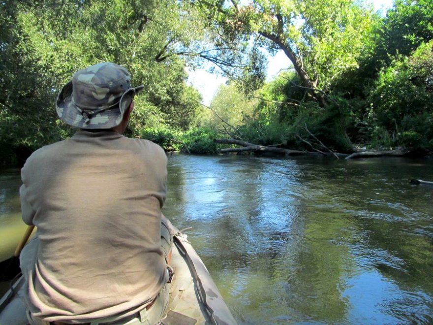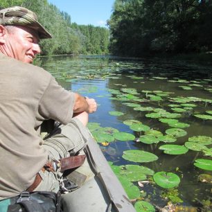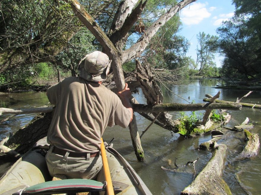 Ještě nás čekala nelehká a ne právě krátká plavba. Volné úseky s širokou hladinou napůl pokrytou listy stulíku čím dál častěji střídaly ježaté padlé stromy a nejrůznější zátarasy. Někde přišla vhod i ubohá pilka na noži. Háček musel mnohokrát odsouvat bariéry z naplaveného dřeva. S pevnou lodí bychom je možná dokázali prorazit, ale hůř by se s ní asi kličkovalo; zvlášť kdyby byla delší.