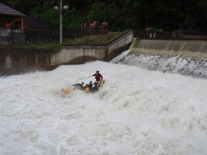 Troufám si tvrdit, že prvními a pravděpodobně jedinými rafťáky na vodě byli v pátek odpoledne kluci z nymburského Sport-clubu 2000. Skoro určitě, protože jiné smutné ksichty ani děravé rafty jsem neviděl. Starý trhač raftů, kamenný stupeň se železnými kolíky sice zmizel a byl nahrazen moderní sklopkou, raftová smrt však odložila svou kosu asi o kilometr níž. Pečlivá prohlídka koryta v okolí staveniště žádnou past neobjevila. Jakmile přitekla voda, jez se sklopil. Další prohlídka a diskuze se odehrávala nad famózním válcem – vždyť to ještě nikdy nikdo nejel!
