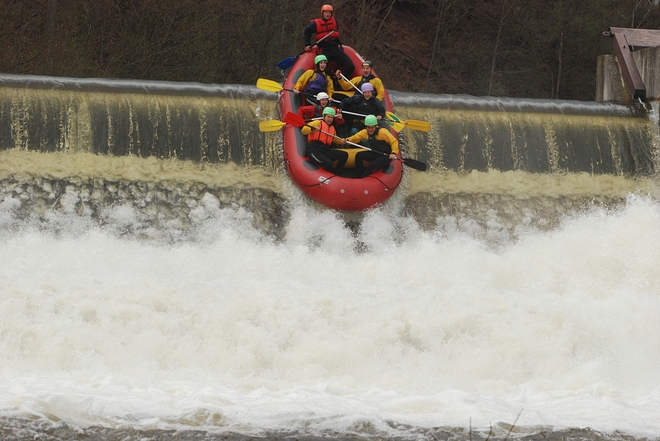 S pocity astronautů zamířily první rafty k novému jezu. Příď se propadla, s divokým stříknutím prorazila vodní válec. Loď bezpečně proplula. Obavy nebyly na místě.