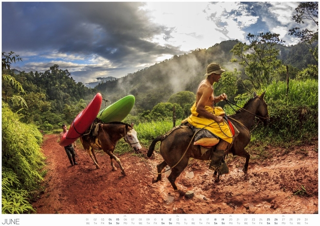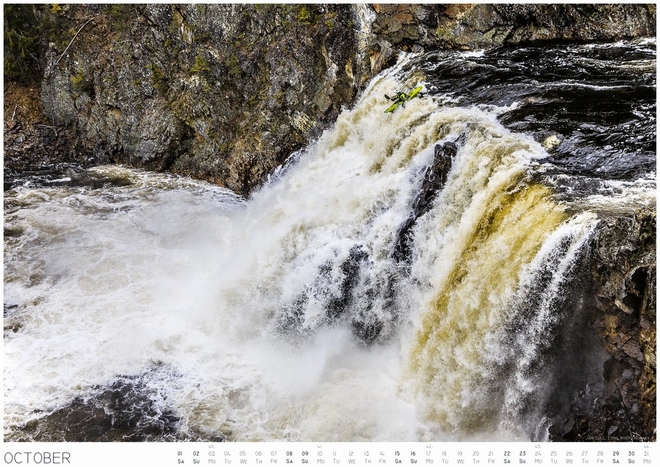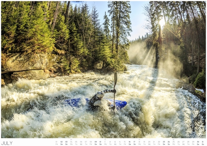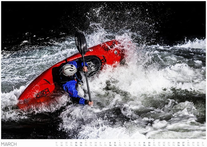 Samotné kalendárium jsem neměl sílu vymýšlet jakkoliv úderné, v jednoduchosti je síla. Z prvotního návrhu tučným písmem v barvách kajaku se mi po zkušebním tisku udělalo mdlo. Vlnité orámování vypadalo také tragicky, takže jsem se mnohem více uchýlil k jednoduchosti – rovný tenký bílý rámeček, jemný font, nic nezvýrazňovat a kalendář je na světě.