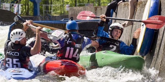 Kdo nešel v sobotu v noci brzo zalehnout, v neděli ráno možná trochu lituje. Kayakcross startuje už v 10:30 a jako každý rok i letos je startovka opravdu nabitá. Protože do nedělního závodu mohou vždy postoupit jen ti nejlepší z nejlepších, šance všech závodníků jsou velmi vyrovnané. Chce to mít opravdu ostré lokty. Již od samotného startovního skoku v polovině trati, až do samého konce, kterým je dotek cílového baneru pod závěrečným skokem, je pořadí a postup do další rozjížďky věc absolutně nejistá. I díky tomu je kayakcross nejkrásnější disciplínou celého víkendu jak pro závodníky tak i pro diváky.