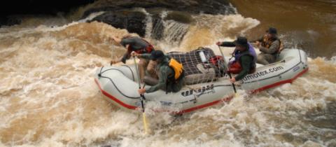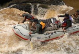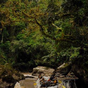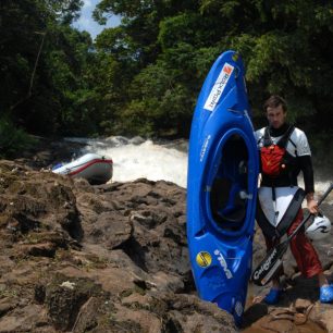 Ráno plni odhodláni vjíždíme do dalších peřejí, řeka začíná padat čím dál tím více a situace nevypadá nejlépe. Raft se převrací, všichni v pořádku, ztratili jsme dvě pádla, jeden foťák, chvíli nám trvá, než se z toho dostaneme, ale musíme dál. Řeka se prokousává mezi obrovskými kameny a s raftem není možné projet. Začíná série přenášení. Nejdříve stodvacetilitrové loďáky, pak raft a následně sedám do kajaku a snažím se někudy projet. Spouští se vydatný déšť, který nás od té doby provází každou noc. Přece jen jsme v deštném pralese. Tábořiště jsou horší a horší.Většinou se nedá mluvit o místu na stan. K večeři nás čeká plátek sušeného masa a pak spánek. Další dny nanovo, pekelný spád, občas celá řeka zmizí v šíleném sifonu, přenášíme. Loďáky začínají být prodřené. Za poslední tři dny jsme ujeli dohromady tak tři kilometry. Přichází únava, první zranění a tady si poprvé kladu otázku, co jsme podcenili. Možná přemíra nadšení a opomenutí, že ne vše musí jít podle našich představ?