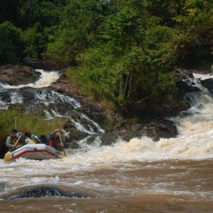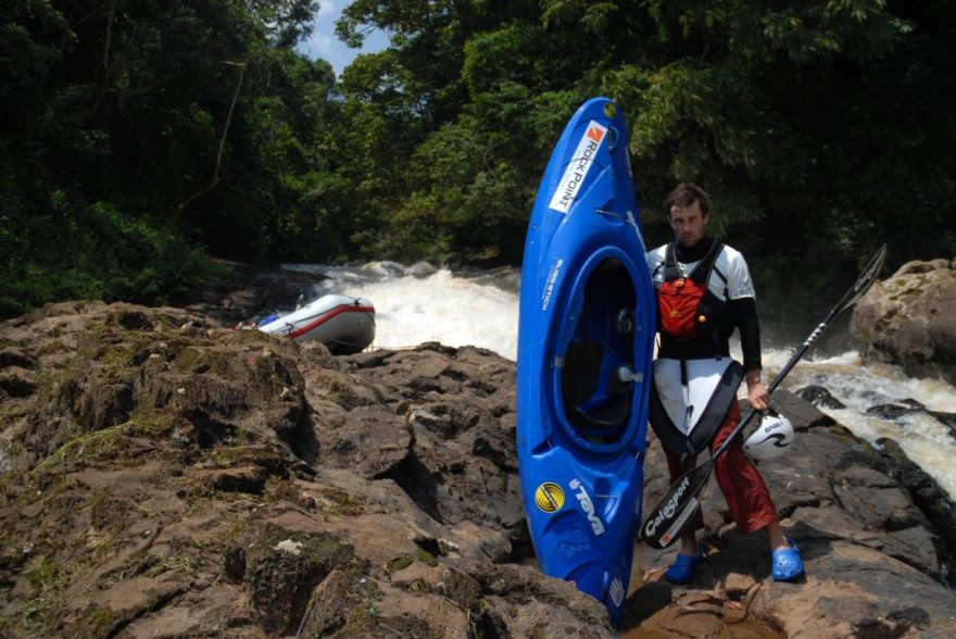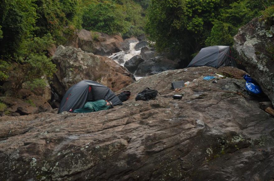 Kolem nás se vytvořila zelená nepropustná hradba a jediná cesta vede směrem dolů po řece. Občas vytáhnu mačetu, abych mohl prohlédnout následující peřej. Mačeta, která má místo ve špičce mého kajaku, se později ukáže jako pilíř celé expedice. Koncem dne se dostáváme do míst, kde řeka začíná nezvykle moc padat dolů, nocujeme na maličkém plácku a jdeme na prohlídku. Řeka začíná ukazovat zuby, několik skoků jdoucích rychle po sobě, to vše vyústí do dvojvodopádu. Raft se musí přenést a veškerá výbava také, na kajaku půjde sjet první půlka, ale druhý vodopád padá do kamenů. Pozoruju lagunu mezi vodopády; není tu moc místa na zastavení, asi tak pět metrů, než se řeka zlomí přes druhý vodopád. Sedám do kajaku a jedu. Začátek dobrý, nabírám rychlost a letím, potřebuju rychle zabrat, abych se dostal do laguny. Nejde to. Vidím hranu, jak se nezadržitelně blíží. Na poslední chvíli si všimnu malého vracáku na samotné hraně. Srovnám špičku, chytám vracák a skáču okamžitě na šutr. Klukům asi dost zatrnulo, když mě viděli vjíždět za hranu nesjízdného vodopádu a pak nevěděli, kde jsem. Vše je v pohodě a my pokračujeme v přenášení druhého vodopádu. Přichází první velký přítok a začínáme se dost ohánět v čím dál tím vydatnějších peřejích. Jedu první a ukazuju klukům, kudy s tím velkým raftem nejlépe projet. Padá noc a my poprvé spíme mezi kameny.