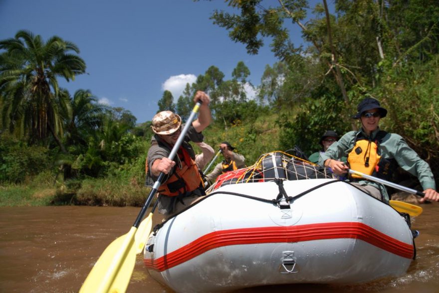 Po několika dnech přijíždíme do městečka Bonga, kde začíná naše vodácká mise. První kontakt s řekou, odvazujeme vše z auta a během několika minut je kolem nás stovka místních. Rozumím jejich zvědavým pohledům. Ten modrý plastový kajak a to nafukovací plavidlo je nad jejich chápání. Nabalujeme raft a až tady vidím, kolik materiálu vezeme s sebou, odhaduji to na 350 kilo, jídlo, stany, spacáky, drobné dárky, mačeta, sekera, pila, a to seznam zdaleka nekončí. Poslední pokus získání informací od místních, ale ti ani nevědí, co je o dvě stě metrů níže po řece, a že tato řeka ústí do Oma, je pro ně novinkou. Konečně vyjíždíme na dlouho očekávanou plavbu. První kilometry si připadáme jako na jiné planetě. Kolem nás nepropustná džungle, opice poskakující po břehu, ohromní ptáci kroužící nad hlavami, neskutečně velcí pavouci skákající do raftu a samozřejmě krásné peřeje do WW IV. První noc usínám nejistý, co nás čeká v následujících dnech a vidím stíny opic v měsíčním svitu, jak probíhají kolem stanů.
