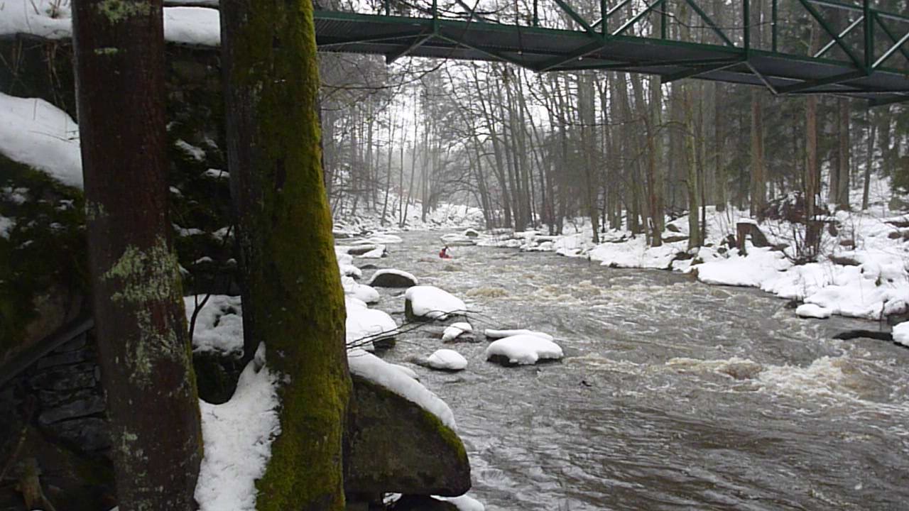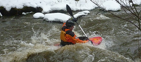 Oblékání na sněhu má vždycky své kouzlo, a když okolo vede silnice, je o zpestření postaráno. Vodní stav byl ucházející, 7 kubíků po dvou měsících abstinence bylo tak akorát. Ta radost být zase na tekoucí vodě! Vymetali jsme každý vracáček, posurfovali si na každé druhé vlnce a jen trochu nadávali na zmrzlé ruce. Jez, nebo spíš stupínek, na ř.k. 5,8 jsem sklouznul při levém břehu, protože váleček pod ním už nevypadal úplně přátelsky. Nebojácný Jenda se rozjel prostředkem a postavil G-Ride na zadek, udělal piruetku a chvilku to vypadalo na slušnou rodeovou vložku, ale nakonec se mu přece jen povedlo vypádlovat. No, taky má ve válci naježděno víc než po řece.