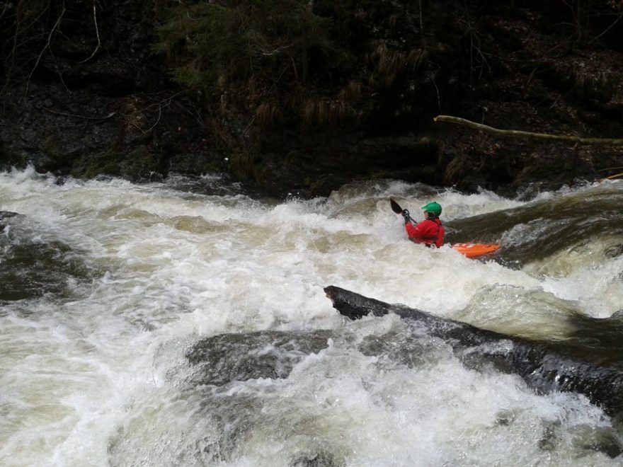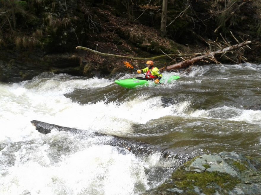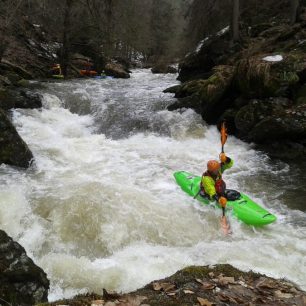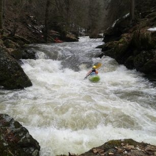 A samotná jízda na vodě? Ze začátku pohoda, jedu jako první a říkám jaké budou úseky řeky, prostě pohoda. Do té doby než přijdou Drškovské schody. Najíždím do nich lajdácky, bokem do rolády, a první eskymák je na světě. Je to hezké probuzení – teplota vody cca 4 °C.
