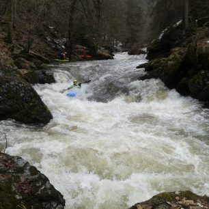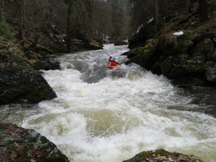 Začalo nám trochu tát, tak co vyrazit na Kamenici? Aplikace nám na vodočtu hlásily stav 83 cm, to je asi 17 m3, takže by to mohlo být pěkné. Zároveň panovaly obavy, že toho teče moc, jelikož jsme to v loňském roce jezdili za stavu 58 cm / 10 m3. A to je trochu rozdíl. Pro zajímavost, závody ve sjezdu se jezdí za stavu 71 cm / 12 m3.