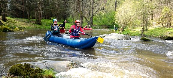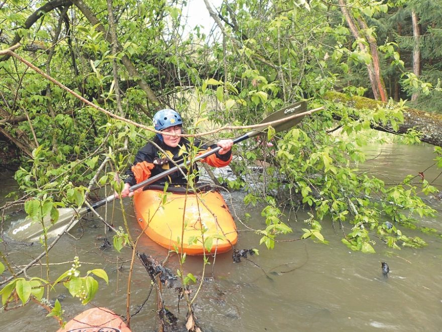 První sjízdná řeka, ke které jsme dojeli, byla Deutsche Thaya. Na nasedacím místě je to pěkná říčka s peřejkou, ale po chvíli se mění v příšernou vrbičkárnu se spoustou padlých stromů, které kajaky někdy obtížně projíždějí. Nafukovačky přenáší a přenáší… snad desetkrát. Loď se pořád plní větvemi, které nestačím vyhazovat. Thayu přejmenováváme na Vojtapíčawasser. Aspoň počasí se umoudřilo a užíváme si jarního sluníčka.