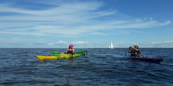 Je poledne, Hanka si chce nafotit zámek a vyrazit k našemu zaparkovanému autu. Je to přes 30 km. To nedáme. Měníme plán. Hanka s Honzou zůstávají na místě, udělají si pádlovací výlet po okolí a já dopádluji pro auto. Osamělou plavbu si užívám. Vlnky jsou tak akorát, teplota dobrá, sluníčko svítí a mírný vítr by mě dotlačil ke břehu, kdyby se něco přihodilo.