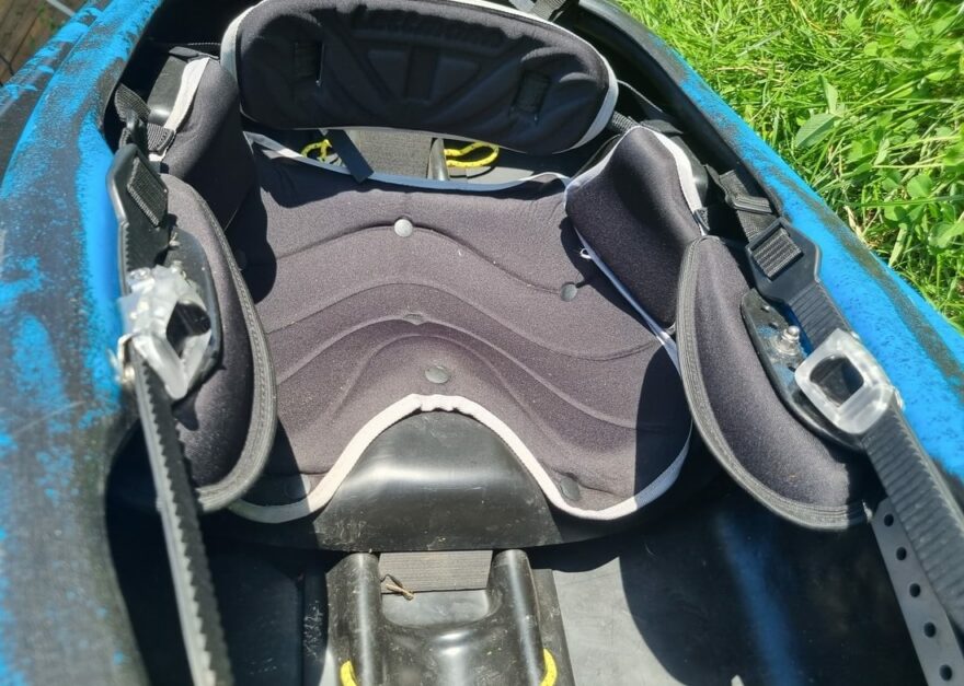 A sezení – to v Lettmannu prostě umí! Jako pro všechny jejich lodě si i u Olympa můžete zvolit dva druhy sedačky, které se liší vybráním na zadek a velikostí „boule“ mezi stehny, která je typická pro slalomové lodě. Zejména druhý typ sezení je ideální pro agresivnější jízdu, protože vás v lodi perfektně zafixuje. Kolenní a kyčelní opěrky jde také zvolit ve dvou velikostech, vždy platí, že ty větší vás svou plochou v lodi udrží lépe. Loď se nabízí pouze s posuvnou opěrkou nohou a pěny místo zrcadla objednat nelze – což je škoda. Standardem těchto „slalomových“ lodí jsou dvě bezpečností madla, jedno na přídi a jedno na zádi. Uvnitř lodi najdeme vertikální a horizontální držák na házečku a třeba lahev.