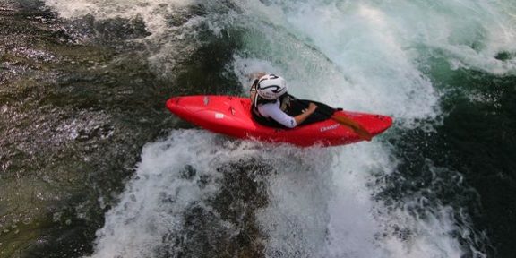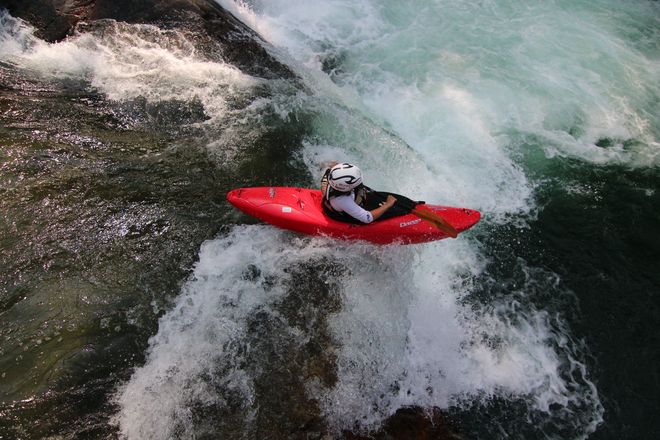 Teď teda já. Neměla jsem úplně nejlepší pocit, hlavně ze slidu nahoře, ale Ben mě ubezpečil, že i když budu zvedat pod skokem, je ještě spoustu času. Normálně bych si určitě nechala zajít chuť, ale když už se jelo tak daleko a ten vodopád je tak pěknej… Tak jo, stavíme záchranu, lezu do lodě opírající se o kmen. Šprajda, dobrý vydýchám se dole ve vracáku. Šup po slajdu dolů, ale ouha, jak se mi nechtělo jet moc bokem, proud mi strhává špičku a vracák už rozhodně nechytím. Ok, tohle jsem nečekala, tak rychle pádlovat doprava. No, co si budeme povídat, nestihla jsem to, malá rychlost, snažím se boofnout, ale není o co, skála je příliš daleko. Váleček pod skokem je docela silnej, zvedám, jenže jsem v hrnci a dávám si další kolečko pod dopadající vodu pod skokem. Hm, tak s lodí odsud asi nevyjedu, tak to zkusíme bez lodi. Další kolečko v hrnci, zašlapání hluboko pod drop a konečně nádech. Házečku vidím až příliš pozdě, vůbec jsem si přes ten hluk nevšimla Benova volání. No co, tak už jí asi nechytím, hezky se srovnat, ať plavu poz adku a hurá, letím!