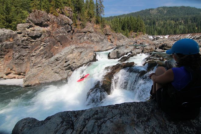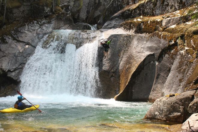 Naložili jsme jídlo, spacáky a hydro do kajaků a rozjeli se po jezeře na kempovací místo na útesech. Večer parádní koupačka, skákání do teplého průzračného jezera, ryby kolem nás, hvězdná obloha s padajícími hvězdami s problikávajícími blesky., nikdy jsem nic podobného neviděla. Prostě BC opět nezklamala svojí nádherou. Ráno zapakovat věci a jen nalehko přepádlovat jezero, krátká vynáška k vodopádu a pak prohlídka. Vodopád jak z obrázku, jediný háček je, že k němu vede obtížný nájezd. Nejprve skluz ze 4 metrů do lagunky těsně nad hranou prvního dropu, kde chcete zůstat na pravé straně a využít v boofu skálu, která je nakloněná doleva. Jenže veškerá voda valí doleva a vymílá pod skokem parádní hrnec, pak je lagunka a vodopád.