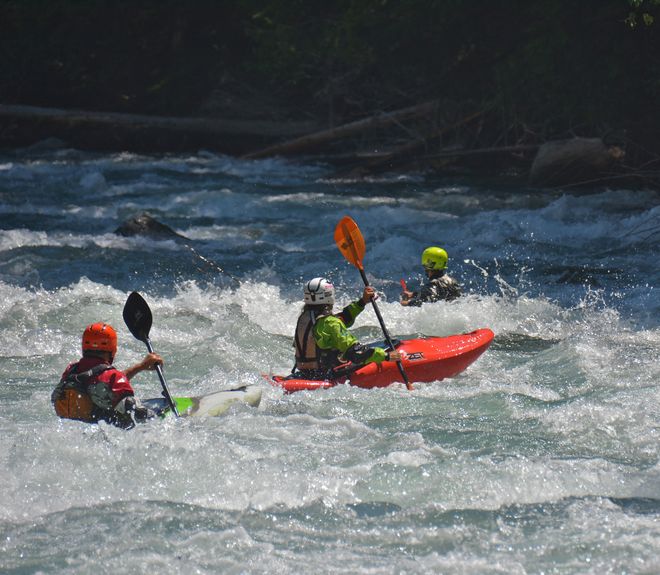 Naskákali jsme do lodí a bezhlavě to nasmažili do první peřeje. Carl zasurfoval hned v prvním válci, pár pokusů o zvedání a rozplavba. Kluci vyrazili za plaváčkem a lodí a já se uklidila do vracáku, nemusim dělat další rodeo. Naštěstí byl se mnou aspoň Hayden a tak jsme pozvolna vyrazili také. Další přej nic těžkýho, ale zvedám, a pak podruhý. Ok, tak se hodit do pohody a zbytečně nedělat chyby. Po pár stech metrech jsme konečně dohnali ostatní, loď i s plaváčkem v pořádku, mohlo se pokračovat. Čtyřkilometrový run, nekonečně mnoho boofů, stále bouldergarden s několika vypečenějšími místy a jednou přenáškou. Moc jsme si to užili i když už mi na konci docházely síly. Kontinuální zábava, naštěstí už žádná záchranná akce neprobíhala. Kuskanax určitě patří mezi nejhezčí creeky, co jsem kdy jela. Všichni máme na tvářích úsměv od ucha k uchu, byla to pecka.