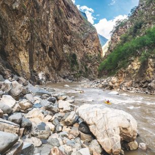 Řeka má opravdu hodně vody nám nezbývá než hledat lajnu mezi velikými kameny, od kterých se odrážejí monstrózní bubláky a karfioly. V kaňonu světlo dlouho nevydrží a hluk divoké vody, uzavřené mezi vysokými stěnami, jen umocňuje tísnivý pocit přicházející tmy. V Peru se stmívá rychle. Naštěstí ještě před setměním stíháme dorazit do tzv. Juanito campu. Trochu nervózně koukáme na oblohu, rychle vaříme a lezeme do spacáků s očekáváním zítřka.
