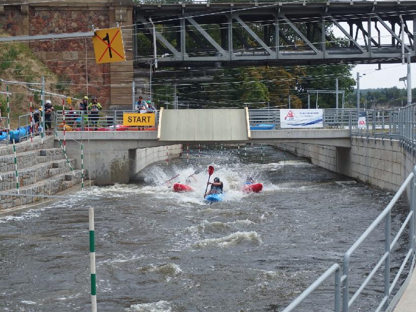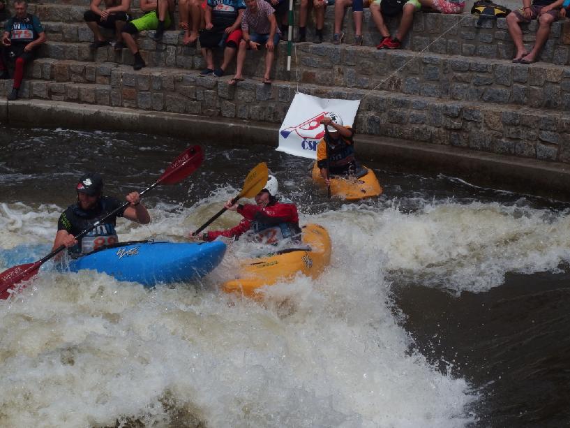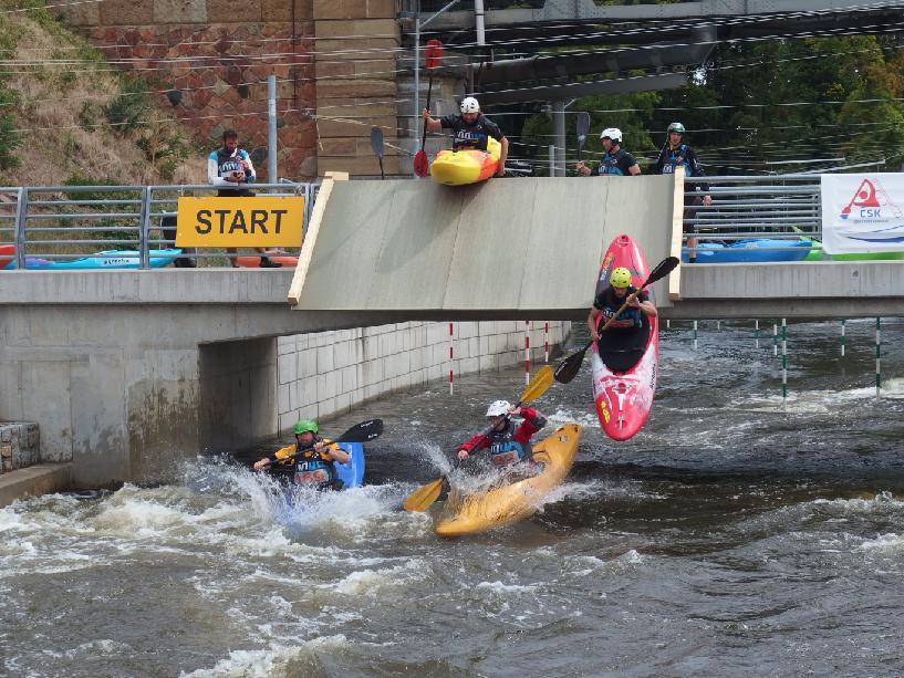 Doufaje, že se nám v letním pařáku neroztečou věci schnoucí na přímém slunci, jsme se pustili na již zmiňovaný sprint. Startovalo se z rampy, tudíž o zchlazení se při dopadu do vody nebyla nouze. Jelo se jen rovně dolů a člověk by čekal, že takový závod proběhne rychle, když už to tedy je sprint, ovšem vzhledem k počtu závodníků v tomto závodu to trvalo o něco déle. Tentokrát dal takřka každý najevo, kdo jsou jeho favorité a dal tak pořádně zabrat i svým hlasivkám.