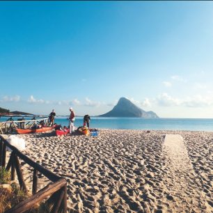 Vystupuje z moře jako hřbet nějakého obrovského pradávného tvora. Táboříme na rozlehlé pastvině u malé kamínkové pláže a Tavolara zabírá celý obzor.