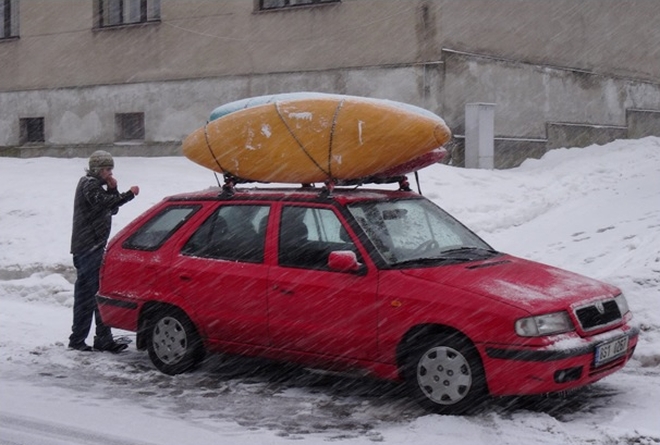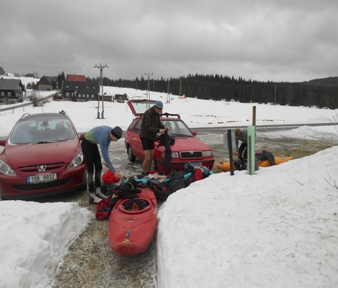 Neděle, budíček v 6, opět u počítače a samozřejmě voda klesá. Jet či nejet, toť otázka, kterou za nás nakonec vyřeší „Slon“. Má to k nám z Příbrami kus, takže zpátky prý teda nepojede. Tak tedy vyrážíme směr Jizerky, značně nejistí. Nálada panuje bídná, zvláště když vidíme, že začíná padat sníh a přituhuje. Přijíždíme na Mýto a jdu se podívat na vodočet Jizery. Má to 85 cm, tak trochu zalžu a povídám, že je to na 90. Nenecháváme se zviklat od jiné vodácké skupiny a vyrážíme směr osada Jizerka. Cestou stále více sněží a potkáváme samé běžkaře, někteří si ťukají na čelo, když vidí naší felicii obsypanou kajaky.