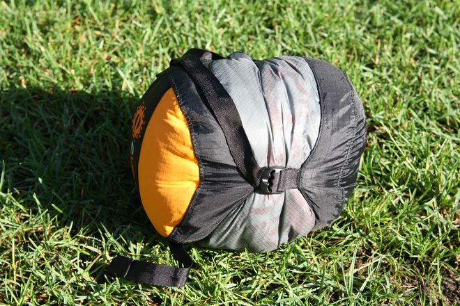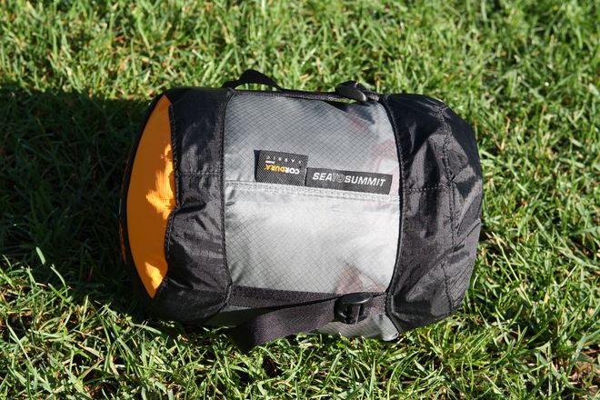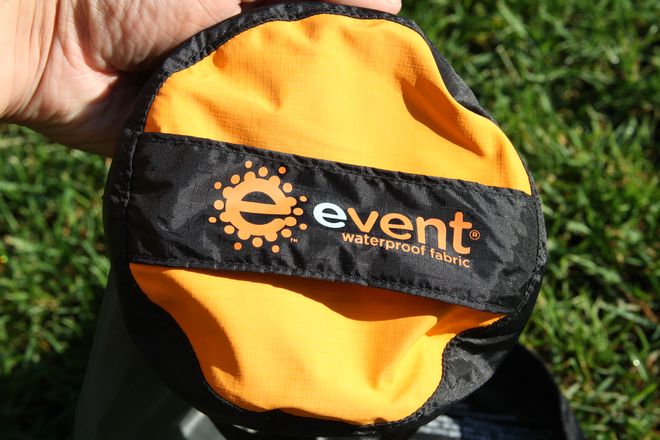 Další důležitou vychytávkou, která s kompresí přímo souvisí a bez které by nebylo tak veliké stlačení nikdy možné, je dno vaku, vyrobené z membránového materiálu eVent, který je prodyšný, propouští tedy vzduch ven. A přesně to je vlastnost, která běžným loďákům chybí. Ať děláte, co děláte, zůstane v nich vzduch a po uzavření ho už ven prostě nedostanete. Existují samozřejmě pytle s ventily, ale už je to další choulostivá a neskladná část loďáku, která dokáže pěkně překážet. Při určité míře šikovnosti se s těmahle vaky dostanete na zajímavé stlačení, ale pořád je to jen zlomek toho, co se dá dosáhnout s Ultra Sil, kde stlačujete zavřený pytel a vzduch skrz membránu odchází, takže stlačení se dá provést, nadneseně řečeno, až do stavu vakua.