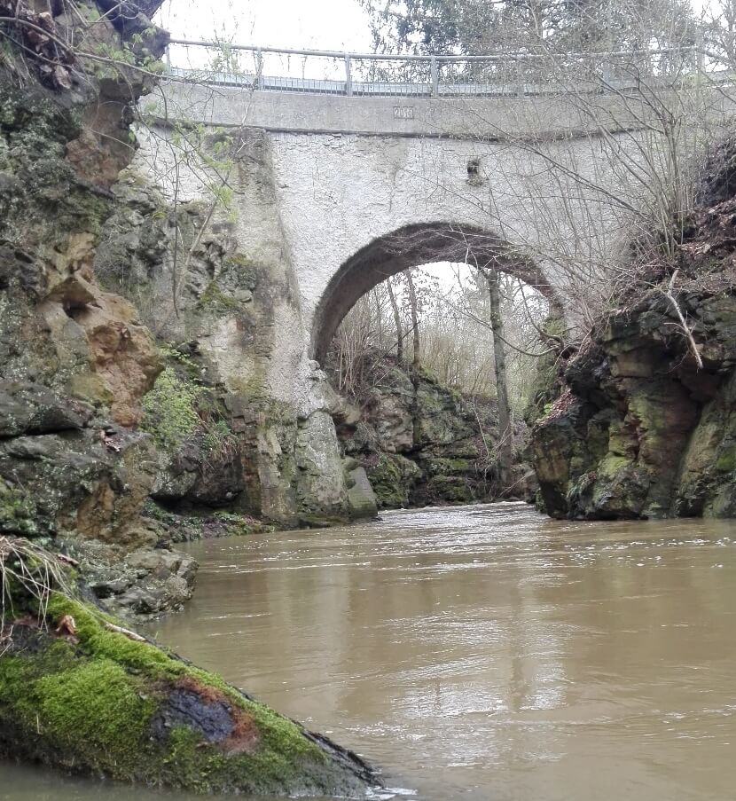 Sebral jsem svého starého singla, navázal na střechu auta a v neděli 16. 4. odpoledne vyrazil k mostu u samoty Kozský. Po překonání strmého svahu ze silnice k potoku nasedám těsně nad mostem a po projetí soutěskou udělám foto mostu.