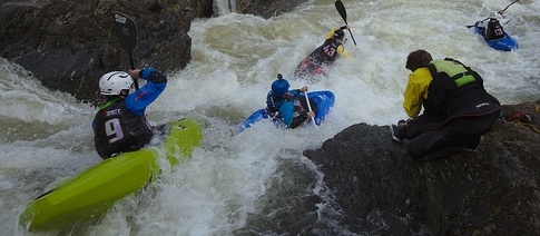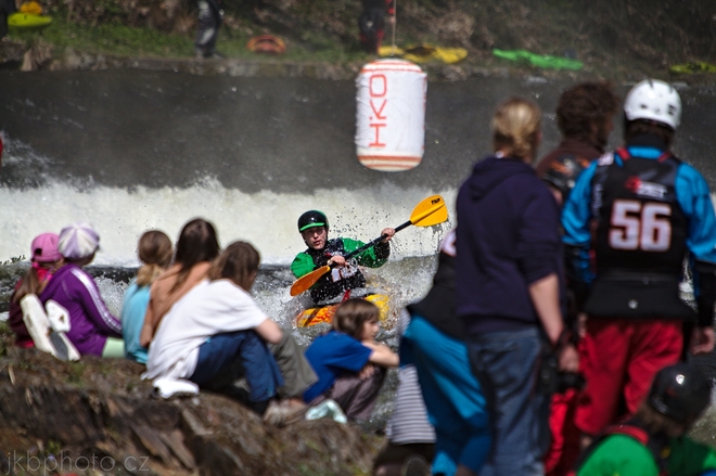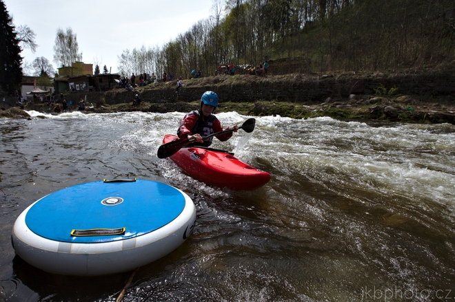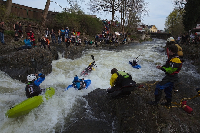 Po sprintu následoval slalom vedený taktéž z rampy přes jez s dotykovým bannerem u hrany, který dokázal vyškolit nejednoho z favoritů, potom prosmyčka mezi kameny v podjezí, rychlý dotyk banneru nad Vrchlabskou a šup zchladit se do válce. Pak ještě čtyři přesazené bannery a cíl. Trať byla poměrně náročná a zejména banner na jezu a prosmyčka mezi kameny byly zábavné. Výsledné časy ze sprintu a slalomu se sečetly a z výsledků vzešlo 32 kajakářů pro kayakcross. V něm si to ti nejlepší rozdávali až do roztrhání těl a bezesporu nevětší atrakcí byl singlíř Honza Choutka, který závodil jak v C1, tak v kajakářích, kde to natřel i těm nejlepším a dostal se až „na bednu“. Vrcholem dne byla určitě finálová kayakcrossová jízda, ve které přijížděl na druhé pozici, těsně za Honzou Kolářem, favorit Viki Legat. Jindy strojově přesný závodník pokazil Vrchlabskou soutěsku a všichni, včetně Honzy Choutky na singlu, ho předfrčeli a zmizeli směrem k cíli. Davy diváků jen nevěřícně zíraly.