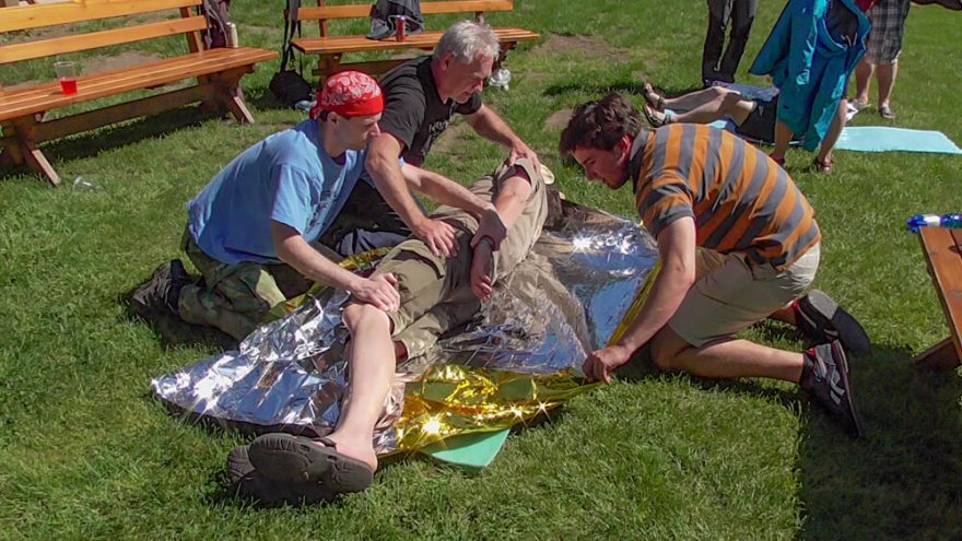 První pomoc by měla být součástí jakéhokoli sportovního vzdělávacího kurzu. Pomocí modelových situací, které se připravují nejen v rámci této části kurzu, ale i nečekaně při provádění jiných činností, se naši lektoři snaží simulovat situace, které mohou v rámci vodní turistiky nastat. Absolventi kurzu nejsou po jeho skončení poloprofesionální záchranáři, ale mají přehled o tom, jakým způsobem zajistit základní životní funkce zraněného, jak komunikovat se záchrannou službou, jak zajistit zbytek skupiny a hlavně, že je důležité zachovat chladnou hlavu.