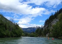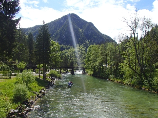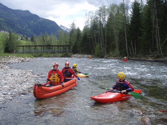 V relativní blízkosti je pěkná řeka [b]Möll[/b] a v horním úseku měla přiměřenou vodu a 13 km pěkné jízdy (most u Kraftwerke – most u Lederer s vodočtem) Nebylo moc vody, tak se muselo obzvlášť na deblech pádlovat a dalo se i cvičit ve vracácích. My jsme měli ale smůlu. Po ranním dešti se udělalo krásně a při přesunu na Gail jsme zapomněli odfouknou rio. Vzpomněli jsme si včas, nepraskl nám. Dno jsme ale neodfoukli, má přeci přetlakový ventil, a asi se nám teplem a tlakem odlepil kousek staré záplaty. Nic jsme netušili, když jsme šli na vodu, ale po chvíli jízdybylo dno měkké a kolena ta nemají ráda skákání po kamenech. Raději jsme to po asi dvou kilometrech vzdali.