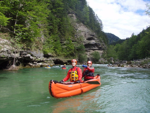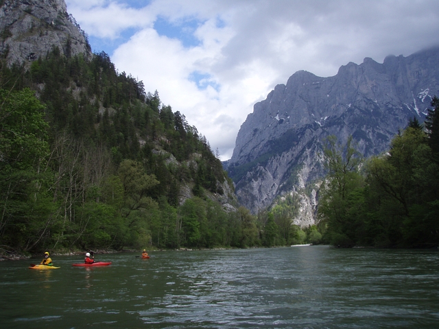 Salza byla blízko minima, ale nezklamala. Odpendlovali jsme od Wildalpenu a sjeli zpět až k tábořišti. Salza byla krásná, čisťoučká, tekla hezky svižně, peřejí jsme si užili. Skály v závěrečném kaňonu byly tmavé, ponuré, sluníčko už na ně nesvítilo a my pozorovali spadané kusy slepenců v korytě i podemleté úzké břehy. Stačí silnější déšť a další slepenec se může octnout na dně koryta.