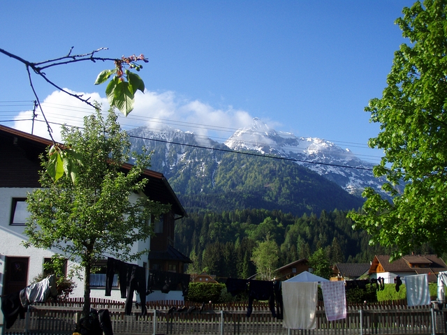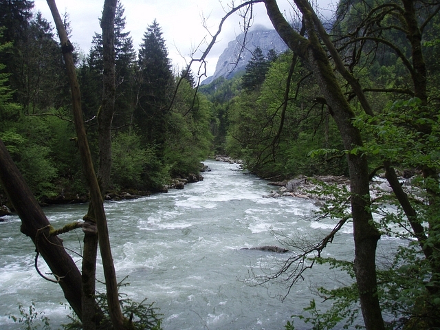 Protože jsme byli dost daleko, tak jsme plánovali jen řeku, kterou bychom sjeli cestou domů v neděli. Na doporučení Honzy Šupa jsme jeli na sever a zakempovali v ještě přepychovějším kempu u městečka Kossen u hranice s Německem. Ráno lilo jako z konve a hory vůbec nebylo vidět. Dojeli jsme k nástupnímu místu na [b]Tiroler Ache[/b] před soutěskou, kde jsme našli policejní ceduli, že je řeka pro vodáky do konce května uzavřena pro nějaký sesuv sněhových zábran. V tom slejváku to tolik nemrzelo, a tak jsme už vyrazili k domovu. Najezdili jsme celkem autem 1500 km, ale v krásné scenerii Alp se zasněženými vrcholky hor, loukama plnýma pampelišek to byla nádhera.